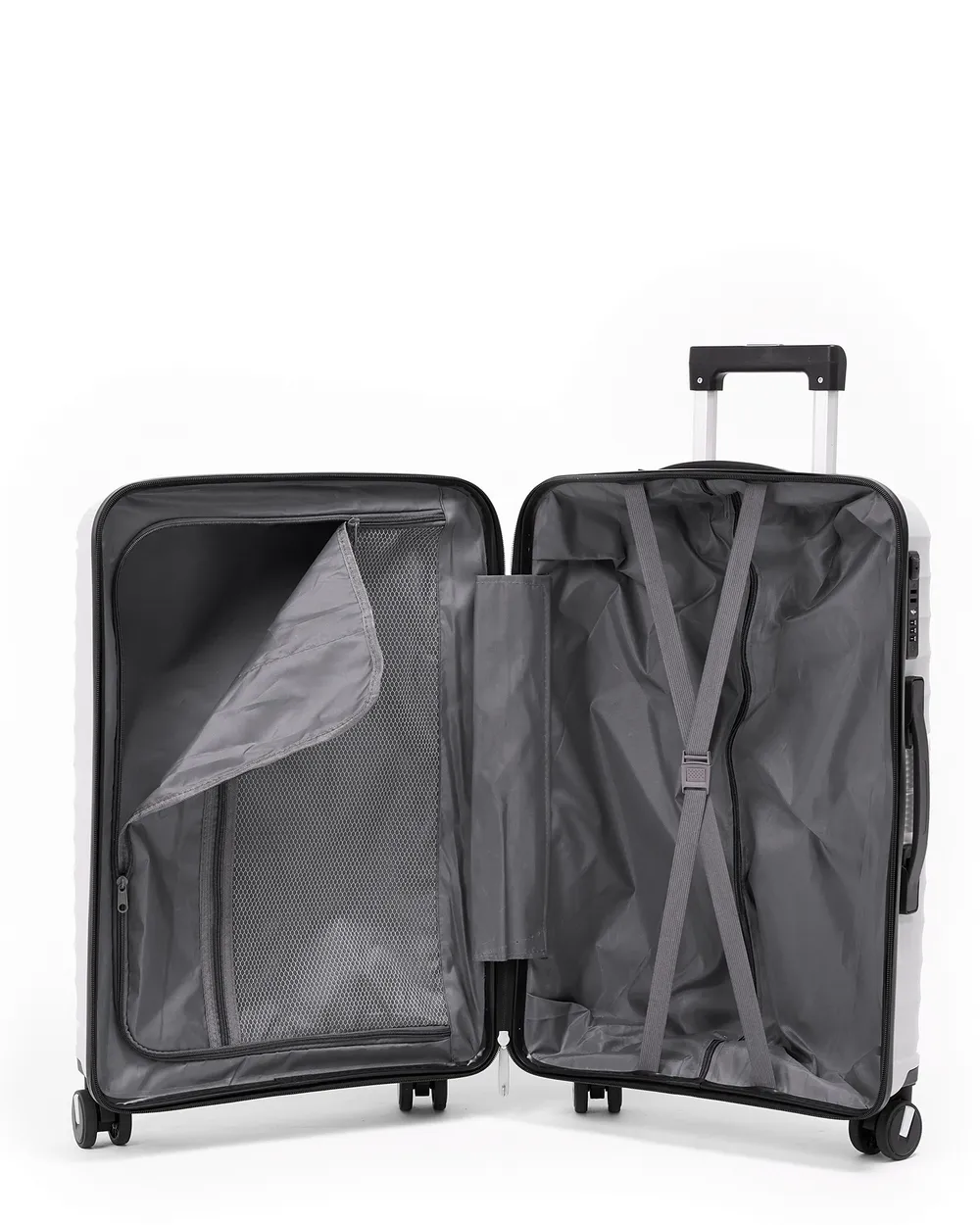 Внутри чемодан разделен молнией на два отделения, также имеются фиксирующие х-образные ремни для удобства укладки вашего багажа.